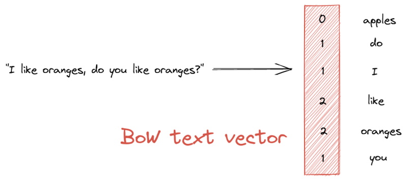One of the simplest vectorization methods for text is a bag-of-words (BoW) representation. A BoW vector has the length of the entire vocabulary — that is, the set of unique words in the corpus. The vector’s values represent the frequency with which each word appears in a given text passage: